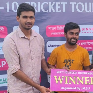 Alongside my involvement in sports organizations, I actively organize and manage sports events and tournaments. This includes the JahidShuvo Challenge Cup, a competitive tournament focused on talent development and sportsmanship, as well as managing the Team JahidShuvo Football Team, where I oversee team coordination and participation in competitive matches. I am also one of the main organizers of the Chattogram Turf Football League, a large-scale tournament designed to deliver a structured, professional football experience on turf. In addition, I am closely involved in organizing the MSP Krira Shongo Long Cricket Tournament, contributing to its planning and execution in every edition. Together, these events reflect my strong commitment to building sports communities through organized, competitive, and well-managed platforms.